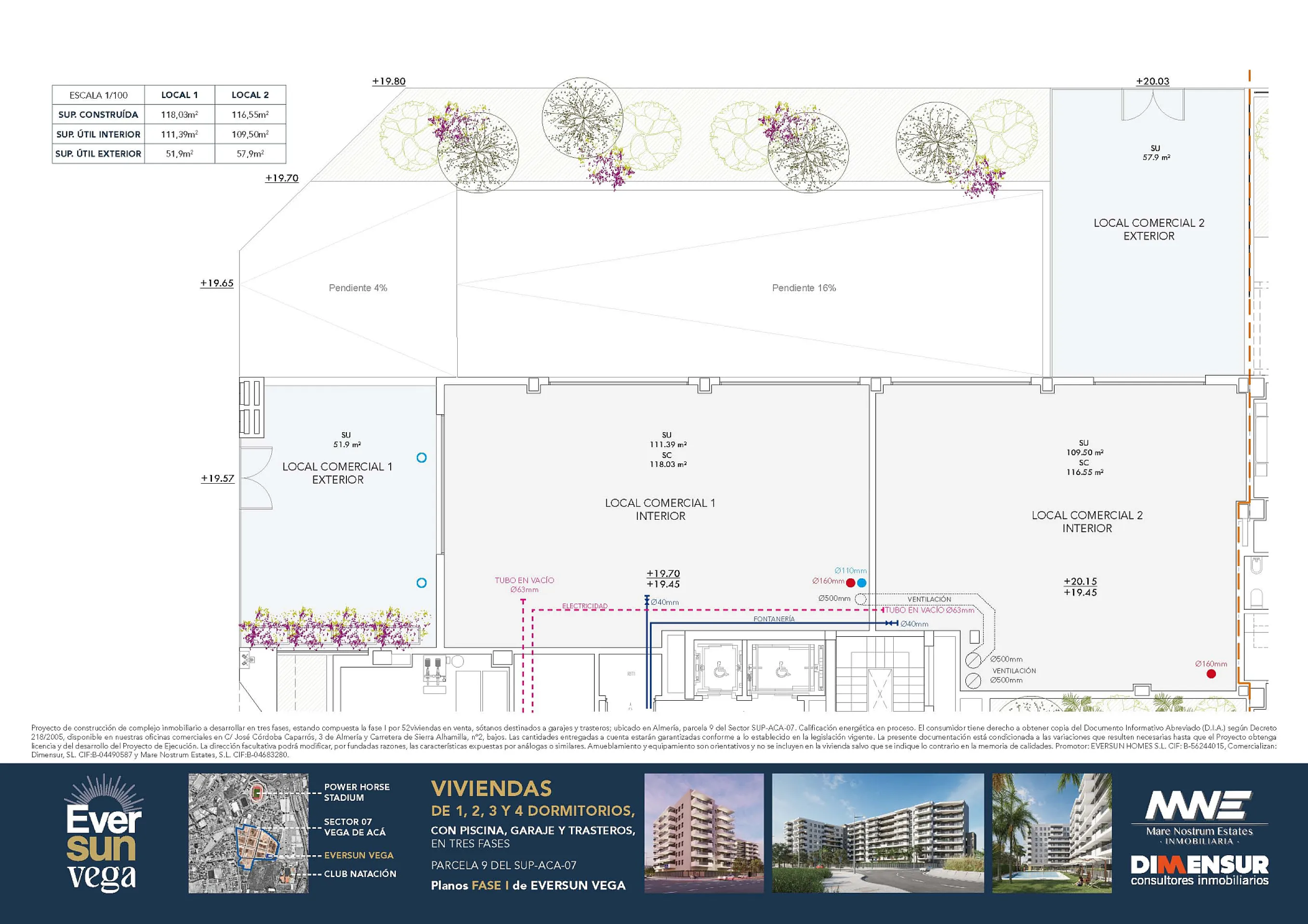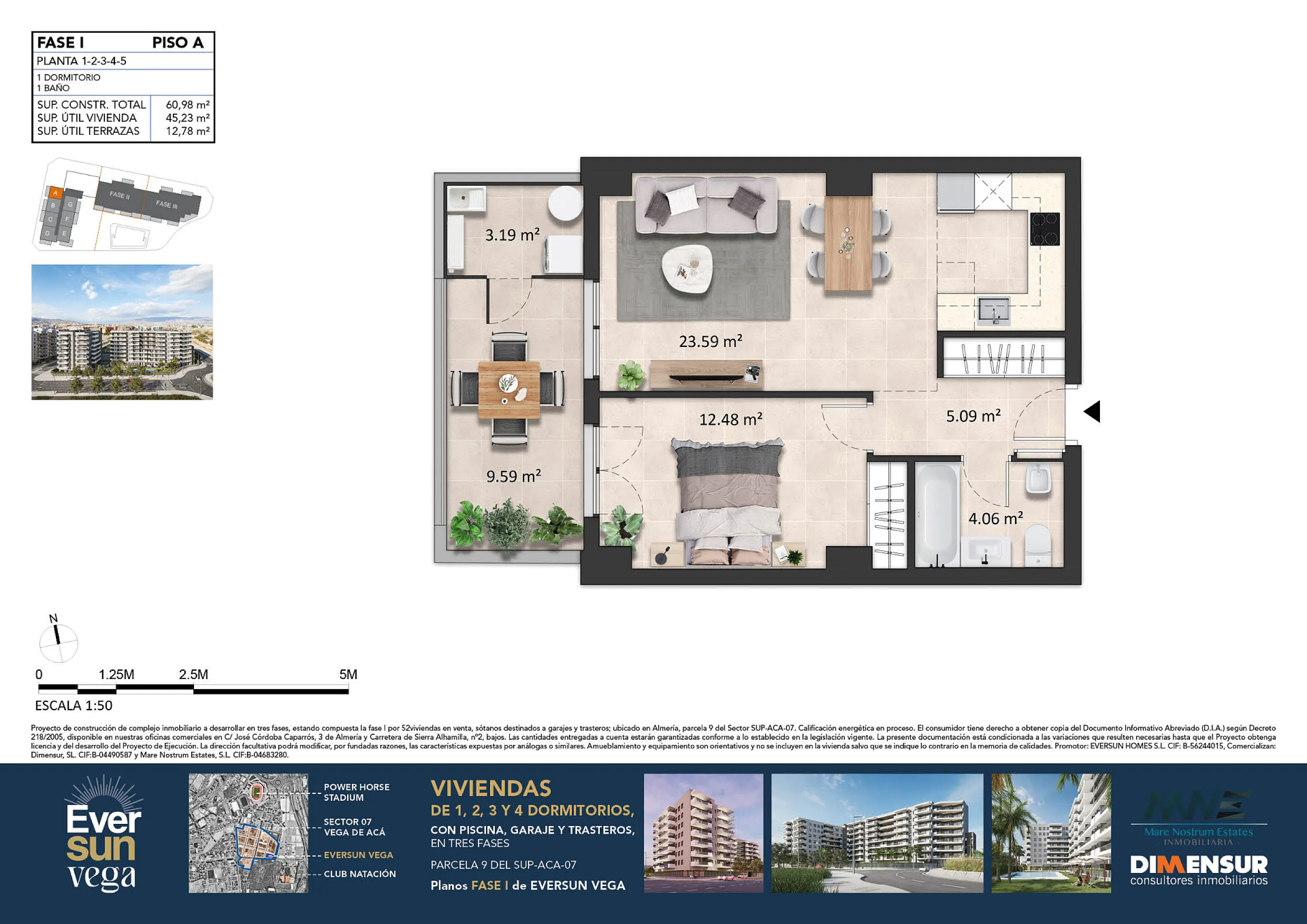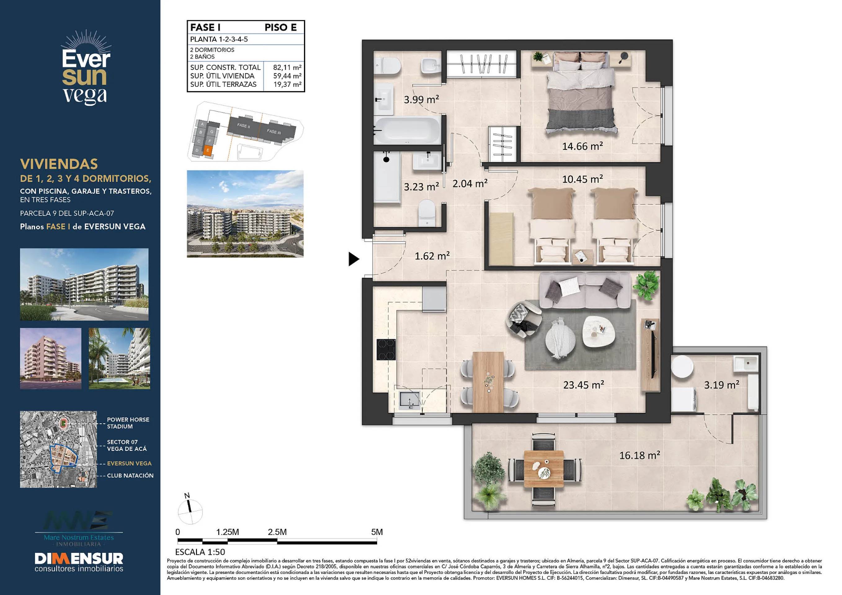 El Residencial de obra nueva, Eversun Vega, es un moderno conjunto de viviendas situado en la mejor zona de expansión de Almería, el sector de la Vega de Acá. El Residencial Eversun Vega es un complejo inmobiliario compuesto por dos bloques residenciales unidos por un local comercial situado en planta baja que cuenta con acceso propio e independiente al residencial. Los edificios destinados a viviendas cuentan con 8 alturas y 3 portales de acceso, albergando un total de 134 viviendas que se desarrollarán en 3 fases constructivas de 52, 39 y 43 viviendas, respectivamente. La planta baja cuenta con zonas comunes exteriores, zona de juego para niños y piscina comunitaria, además de contar las viviendas de esta planta baja con parcela y jardín privado. En los sótanos del residencial se ubican plazas de garaje y trasteros suficientes para dotar a las viviendas de todos los servicios complementarios.