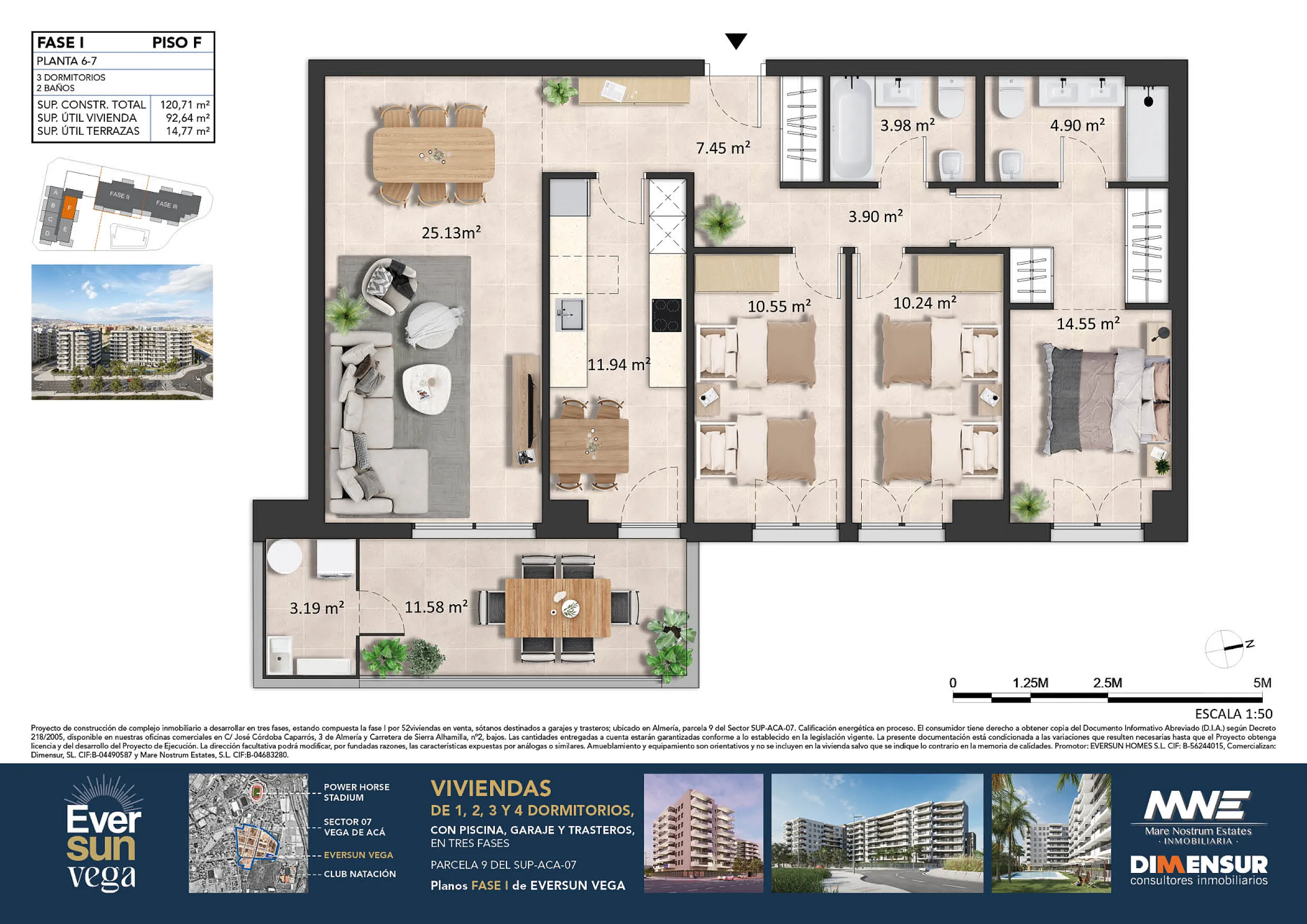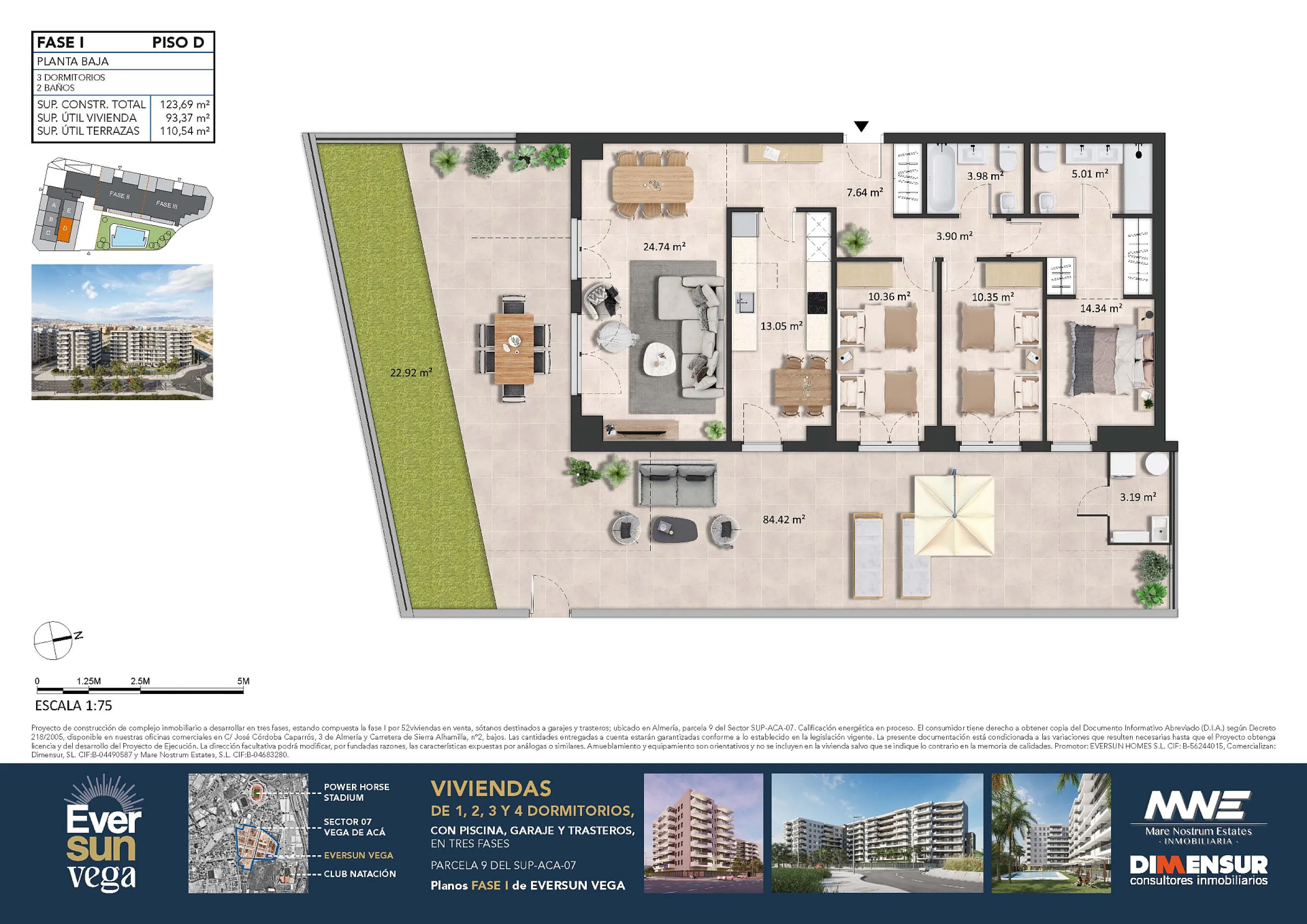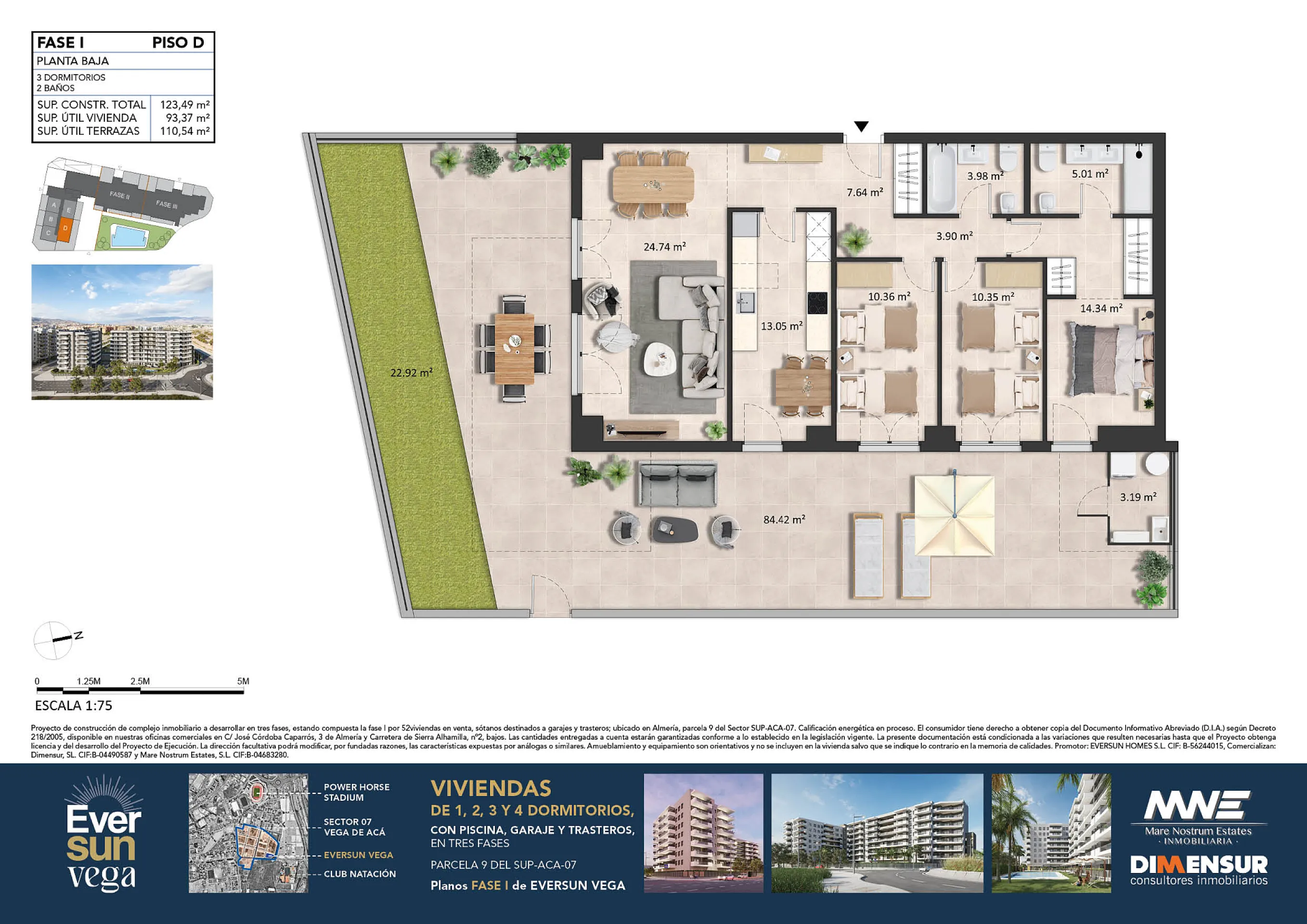 El Residencial de obra nueva, Eversun Vega, es un moderno conjunto de viviendas situado en la mejor zona de expansión de Almería, el sector de la Vega de Acá. El Residencial Eversun Vega es un complejo inmobiliario compuesto por dos bloques residenciales unidos por un local comercial situado en planta baja que cuenta con acceso propio e independiente al residencial. Los edificios destinados a viviendas cuentan con 8 alturas y 3 portales de acceso, albergando un total de 134 viviendas que se desarrollarán en 3 fases constructivas de 52, 39 y 43 viviendas, respectivamente. La planta baja cuenta con zonas comunes exteriores, zona de juego para niños y piscina comunitaria, además de contar las viviendas de esta planta baja con parcela y jardín privado. En los sótanos del residencial se ubican plazas de garaje y trasteros suficientes para dotar a las viviendas de todos los servicios complementarios.